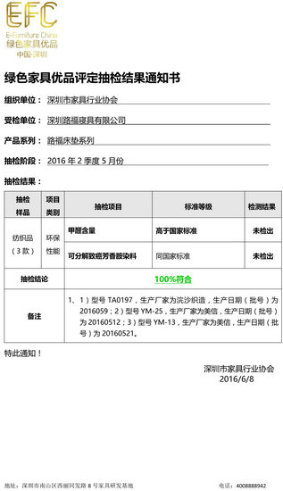 5月的“中國綠色家具優(yōu)品”抽檢,深圳路福寢具有限公司抽檢合格率再次達(dá)到100%,連續(xù)五個(gè)月抽檢合格,堪稱健康寢具品質(zhì)標(biāo)桿企業(yè)。