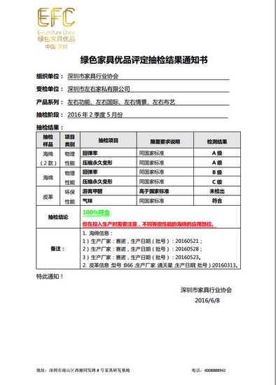 為此,左右沙發(fā)更加重視質(zhì)量管理和品質(zhì)提升,從原材料品質(zhì)監(jiān)控到生產(chǎn)制造的每個(gè)細(xì)節(jié),都追求精益求精。作為中國(guó)唯一一家獲得“中國(guó)綠色家具優(yōu)品”認(rèn)證的沙發(fā)企業(yè),左右沙發(fā)積極參與并推動(dòng)“中國(guó)綠色家具優(yōu)品”工作。