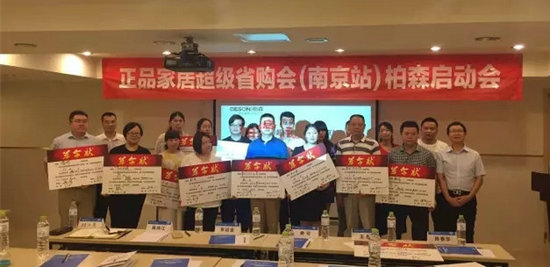 2016年7月18日,正品家居超級省購會(南京站)柏森啟動會在南京市卡子門錦江之星酒店盛大舉行,柏森總部品牌總監(jiān)張運金、紅星集團(tuán)招商管理中心聯(lián)合營銷市場部長婁可,第三方執(zhí)行公司超級腕江浙區(qū)域總經(jīng)理陳春華參會,來自南京、溧水、徐州等八個城市的柏森經(jīng)銷商和店長參加會議并簽署了軍令狀。
