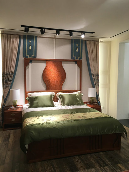 這是調(diào)燈后的效果展現(xiàn)(圖片由神話定制照明提供應用案例)通過天花可調(diào)角度軌道射燈,對床屏的雕花部分和床頭進行重點照明,營造較高的照度,將消費者的目光導向最能體現(xiàn)產(chǎn)品價值的地方。