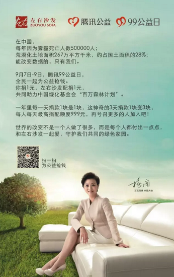 隨著全民公益日—99公益日的到來,左右踴躍響應(yīng),一不小心成為首個助力互聯(lián)網(wǎng)公益事業(yè)的傳統(tǒng)企業(yè),領(lǐng)跑了全行業(yè)。嘴上說得輕巧,但左右沙發(fā)為公益真是操碎了心,不僅發(fā)動所有媒體力量號召全民為綠色行動起來,而且和騰訊聯(lián)手承諾:你捐一塊,我們聯(lián)合捐助兩塊,一起為防沙漠化建設(shè)添磚加瓦。