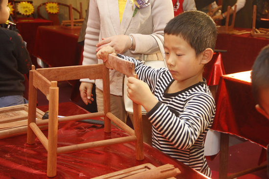大賽比賽項(xiàng)目,是將小方凳分開(kāi)的各榫卯部件重新組合成凳子,誰(shuí)組裝的越快越牢固,誰(shuí)將獲勝。比賽之前,由友聯(lián)為家木工師傅檢查比賽素材是否完整統(tǒng)一,并示范榫卯方凳的組成步驟。當(dāng)一根根木棍和幾塊木板在幾分鐘之內(nèi)變成了一張凳子,許多小朋友都看呆了。