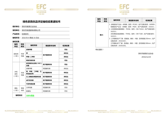 12月23日,中國綠色家具優(yōu)品2016年四季度10月份抽檢工作完成,松堡王國本月共抽檢2款膠粘劑、2款水性涂料及2款路軌,原輔材料抽檢合格率100%,作為首批優(yōu)品獲證企業(yè),品質(zhì)再次引領兒童家具。