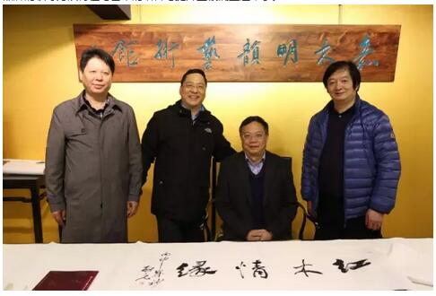 “嘉木明韻”董事長王嘉明先生(左二)與寧波市副市長張明華(右二)、寧波市文聯(lián)原黨組書記鄒大鳴(左一)國家級非物質(zhì)文化遺產(chǎn)項(xiàng)目明式家具制作技藝代表性傳承人許建平大師(右一)合影留念