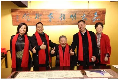 “嘉木明韻”董事長王嘉明先生(左二)與寧波書畫泰斗劉文選先生(中)合影留念