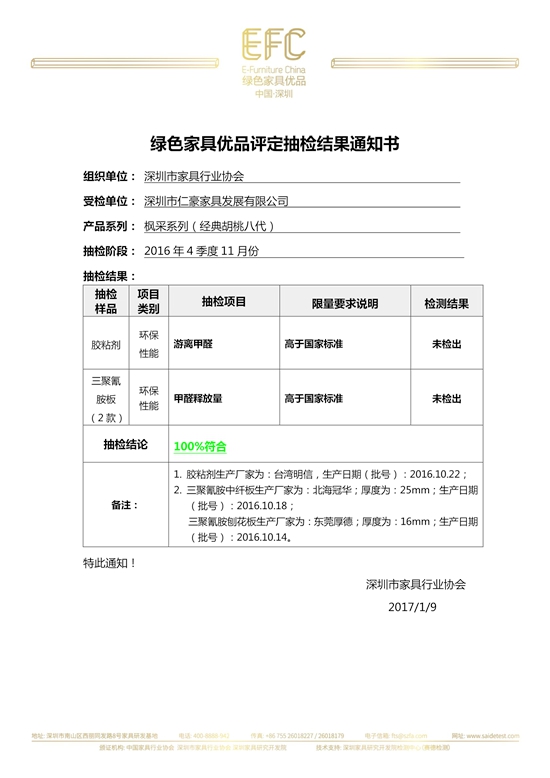 中國綠色家具優(yōu)品工作啟動以來,抽檢工作在深圳家具研究開發(fā)院檢測中心(賽德檢測)主導下有條不紊的進行。2017年初,2016年4季度11月份的抽檢工作圓滿完成,深圳市仁豪家具發(fā)展有限公司楓采系列(經(jīng)典胡桃八代)抽檢結(jié)果100%符合。