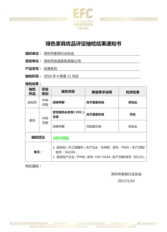 中國綠色家具優(yōu)品工作啟動以來,抽檢工作在深圳家具研究開發(fā)院檢測中心(賽德檢測)主導(dǎo)下有條不紊的進(jìn)行。2017年初,2016年4季度11月份的抽檢工作圓滿完成,深圳市森堡家俬有限公司經(jīng)典系列抽檢結(jié)果100%符合。