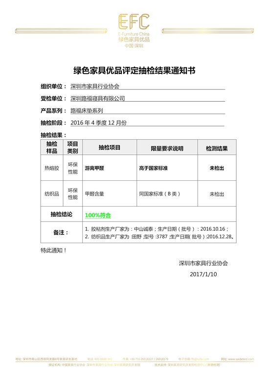 2017年1月10日,2016年中國綠色家具優(yōu)品四季度12月抽檢工作完成,深圳路福寢具有限公司路福床墊系列當(dāng)月抽取的熱熔膠和紡織品的游離甲醛、甲醛含量抽檢結(jié)果均“未檢出”,抽檢合格率100%。