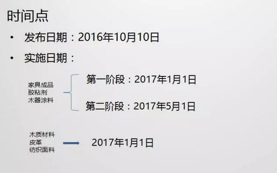 實(shí)施日期:家具成品、膠粘劑、木器涂料分二個階段:第一階段2017年1月1日,第二階段2017年5月1日。木質(zhì)材料、皮革、紡織面料只有一個階段:2017年1月1日。