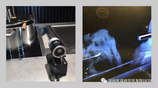 ▲某櫥柜品牌用攝像頭拍攝吸油煙效果(左),在大屏幕上現(xiàn)場直播(右)