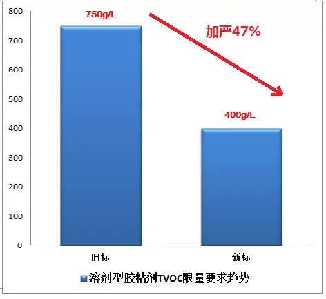 游離甲醛、苯、甲苯+乙苯+二甲苯、游離甲苯二異氰酸酯、丙酮、鹵代烴的限量要求較舊標(biāo)準(zhǔn)無發(fā)生變化。重大的變化在于總揮發(fā)性有機(jī)物含量(TVOC),按照目前市場上的產(chǎn)品,能達(dá)到低于400g/L的溶劑型膠粘劑極少,這也就需要膠粘劑供應(yīng)商做出相應(yīng)的調(diào)整。