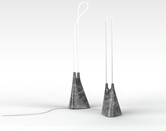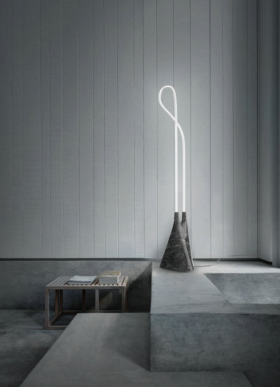 它將扭曲曼妙的的燈管直接裸露在外面,底部是一整塊大理石切割而成的底座。輕盈的光感從沉重的石頭中沖出的對比感,是這個設(shè)計主要想表達(dá)的效果。