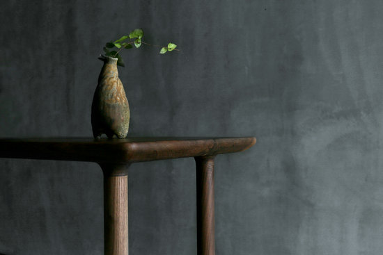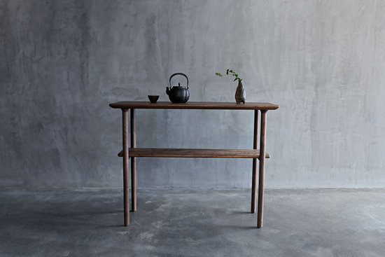 初看茶臺(tái),讓人不禁回憶舊時(shí)故里,放置在高堂的高桌,素雅與靜怡。茶臺(tái)由純黑桃木制做,利用榫卯結(jié)構(gòu),搭建上下兩層,加大了放置物品的空間與增加了便利性。從舊日的高桌中提煉質(zhì)樸,從當(dāng)代居家需求中加以改良。