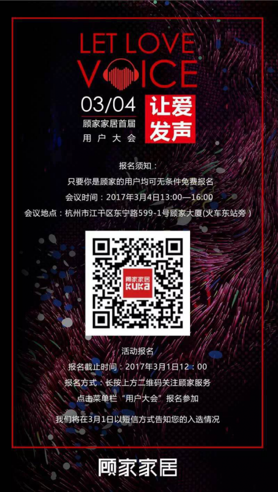 “讓愛發(fā)聲·顧家家居首屆用戶大會(huì)”是顧家家居為更深入地傾聽、了解消費(fèi)者,搭建的以“用戶”為主體的交流平臺(tái)。在此次大會(huì)上,“用戶”將成為絕對(duì)主角,顧家家居高管也將悉數(shù)到場(chǎng),現(xiàn)場(chǎng)與消費(fèi)者交流,解決用戶關(guān)注的問題,聽取意見和建議,并與消費(fèi)者誠(chéng)意分享顧家家居在品牌、設(shè)計(jì)研發(fā)和未來行業(yè)趨勢(shì)以及智能家居等方向的規(guī)劃,通過“顧家首席生活資訊顧問”與用戶一起描述未來的生活方式……活動(dòng)中,顧家家居將徹底放下品牌身段,走入用戶群里,與用戶緊密結(jié)合,讓用戶進(jìn)入顧家的發(fā)展之路中,一起參與美好家居生活的創(chuàng)造。