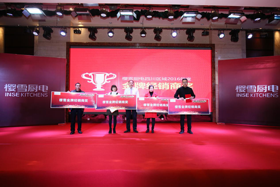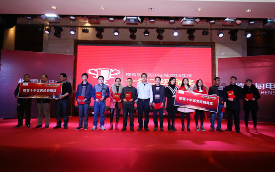 圖為李榮坤董事長(左3)為櫻雪四川區(qū)域2016年度金牌經(jīng)銷商頒獎(jiǎng)