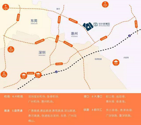 同時(shí),“深莞惠一體化”戰(zhàn)略下,豐富的交通網(wǎng)絡(luò)加速建設(shè)。深圳外環(huán)貫穿華葉家博園,新深惠快線直通深圳,周邊有廣惠高速、惠鹽高速、惠莞高速、深汕高速、惠河高速五條高速。未來深圳地鐵14號(hào)線、16號(hào)線將會(huì)直通惠陽。另外,華葉家博園還連接惠州機(jī)場(chǎng)、惠州港等交通樞紐,打造四維立體交通網(wǎng),將成為深惠家具乃至中國家具高速發(fā)展的血脈。