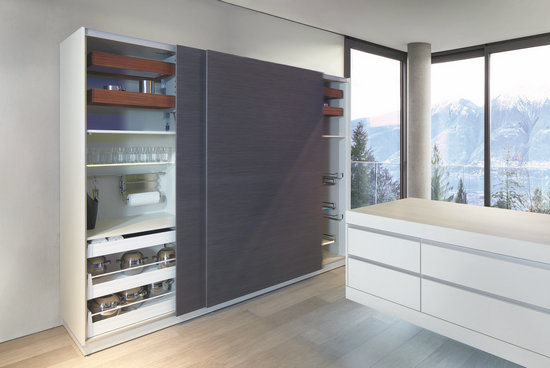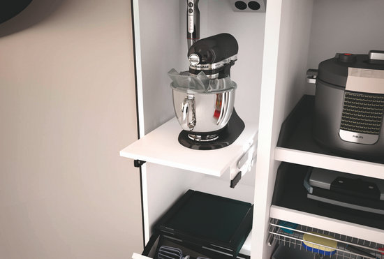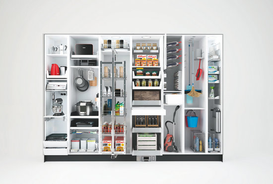 無論是三餐還是一頓盛宴,都需要多方的廚房用品合力協(xié)作。由此,海福樂充分利用廚房的縱向、轉(zhuǎn)角和內(nèi)部更深的空間,設(shè)計(jì)了立柜和吊柜、轉(zhuǎn)角拉籃、凹型抽屜拉籃以及可伸縮的拉籃,以增強(qiáng)儲(chǔ)藏能力??梢绘I掌控的廚用電動(dòng)升降五金、移動(dòng)烤箱或微波爐等,則讓整個(gè)空間更加自動(dòng)、簡(jiǎn)潔。