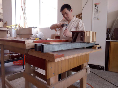 張德軍,豐成帝納的成型師傅。他2009來(lái)到豐成帝納,感受很深的事情,初來(lái)乍到,不懂技術(shù),后來(lái)在木工主管的教導(dǎo)下,投入時(shí)間與精力,他不停地嘗試,不停地失敗,卻愈挫愈勇。不過(guò)他骨子里那份不服輸?shù)膱?zhí)著和倔強(qiáng)卻催促著他進(jìn)一步鉆研,又歷經(jīng)了幾年的打磨,才有了如今高超的技藝。“眼看手抹”是他總結(jié)的四字箴言,看似簡(jiǎn)單,卻少不了多年的實(shí)戰(zhàn)和總結(jié)。因?yàn)殚L(zhǎng)期握木塊,張德軍手上滿是老繭,還時(shí)常長(zhǎng)出水泡。