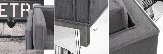 這樣一款平易隨性的沙發(fā),并不代表對細(xì)節(jié)的忽略。INK+IVY設(shè)計師在Grant系列沙發(fā)中的顏色選擇上,使用了低飽和度的灰色,易于搭配,經(jīng)久耐看。沙發(fā)采用全直線凸邊設(shè)計,塑造立體硬朗質(zhì)感。在沙發(fā)金屬腳部分,設(shè)計師選擇了做舊質(zhì)感,在細(xì)節(jié)處呈現(xiàn)復(fù)古與酷感。