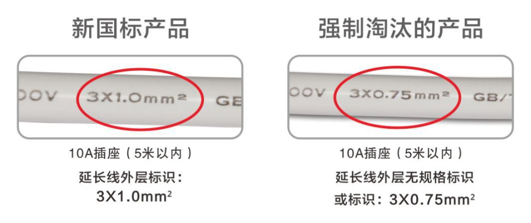 也就是說,新國(guó)標(biāo)規(guī)定10A排插延長(zhǎng)線線芯不得小于1mm²,而市面上仍在流通的0.75mm²線芯規(guī)格的插線板,均屬于明令限期要淘汰的產(chǎn)品。