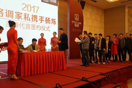 在愉快的氣氛中,格調(diào)家私董事長(zhǎng)總經(jīng)理李建煌先生、格調(diào)家私營(yíng)銷中心副總經(jīng)理張杰先生、武漢格調(diào)經(jīng)銷商周錦輝先生上臺(tái)與楊爍先生一起,共同啟動(dòng)簽約儀式,屏幕絢麗的燈光特效隨即引出楊爍先生為格調(diào)拍攝的海報(bào),至此簽約儀式正式完成。
