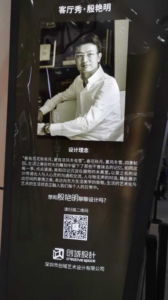 殷艷明說:“我?guī)ьI(lǐng)大家看我的作品,是引領(lǐng)大家進入一種境界,人生一共有三種境界,分別是物境,心境和意境。物境是最容易感受的一種境地,這種感受隨著場景的變化而變化,這時你的心境就會發(fā)生變化,物境和心境會互相影響,而最高的境界便是意境,這就是所謂的境由心生。很多設(shè)計師問我設(shè)計作品的時候有沒有運用一些哲學思想,我的作品中的確運用過很多哲學思想去指導(dǎo)我創(chuàng)作,我設(shè)計作品時的核心思想是平和中有精彩。”