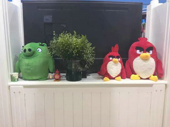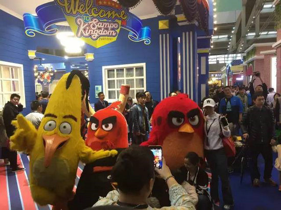 遠(yuǎn)遠(yuǎn)看去,松堡王國的展位顯得十分特別,顏色鮮明,綠植圍繞,彰顯了其百花齊放的設(shè)計(jì)理念。更為重要的是,門口站了三只大大的玩偶——來自芬蘭的三只萌萌的憤怒的小鳥,引來眾人爭相合照,引爆了現(xiàn)場人流。