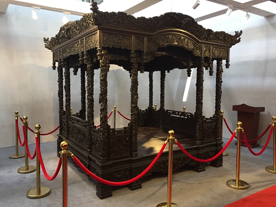 在老周家居入口處擺放著一張古色古香、氣勢恢宏的傳統(tǒng)中式床,在展覽期間,每時每刻都有觀眾圍在此處駐足參觀,連連驚嘆。據(jù)老周家居營銷總監(jiān)孫先俊介紹,這張按照清朝宮廷家具一比一的比例打造的“乾坤大寶床”采用720度鏤空雕花手工雕刻而成,由30個二十年以上工齡的工匠耗時3年采用大葉紫檀制作。此床一經(jīng)推出就引起了行業(yè)強烈的反響和媒體爭相報道。在本次展會上也是展出單品價值最高的家具。孫先俊談到,這張床充分體現(xiàn)了老周家居工匠深厚的工藝技術(shù)和對傳統(tǒng)中式紅木文化精髓的研究。而事實也證明,在簡約現(xiàn)代風(fēng)格大行其道的今天,傳統(tǒng)家具國粹仍然受到了很多人的贊賞和喜愛。