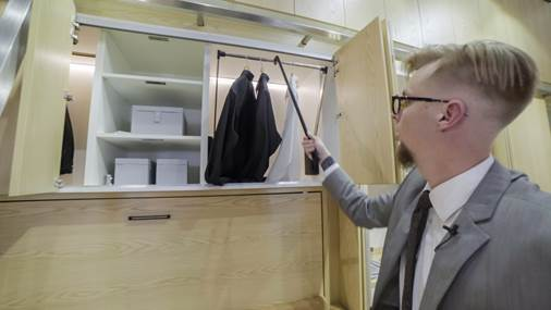 單身青年或小情侶的私密天地,1.8米柔軟大床、大型衣柜、書(shū)柜設(shè)計(jì),帶來(lái)溫馨自由的快樂(lè)時(shí)光。海福樂(lè)silent-fold 40 折疊推拉門(mén),靜音開(kāi)啟,省力省空間。各種領(lǐng)帶架,襯衫架,襪子格,臟物籃,褲架等一應(yīng)俱全,體現(xiàn)多種人性化收納設(shè)計(jì)。