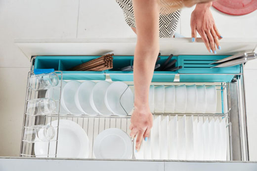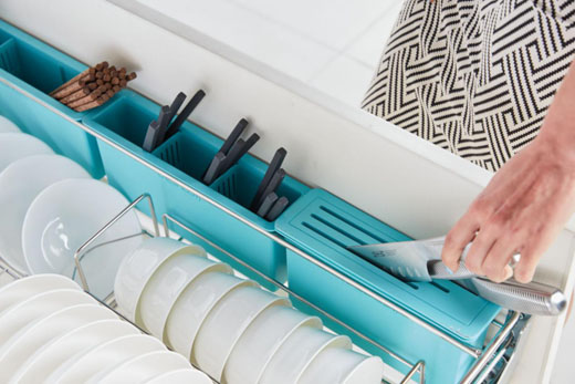 可整體提放的碗碟架、調(diào)味架、杯架、盒子,使用時方便置于案臺或清潔,用畢迅速回籠籃體歸位,便利操作,為廚房作業(yè)提速。