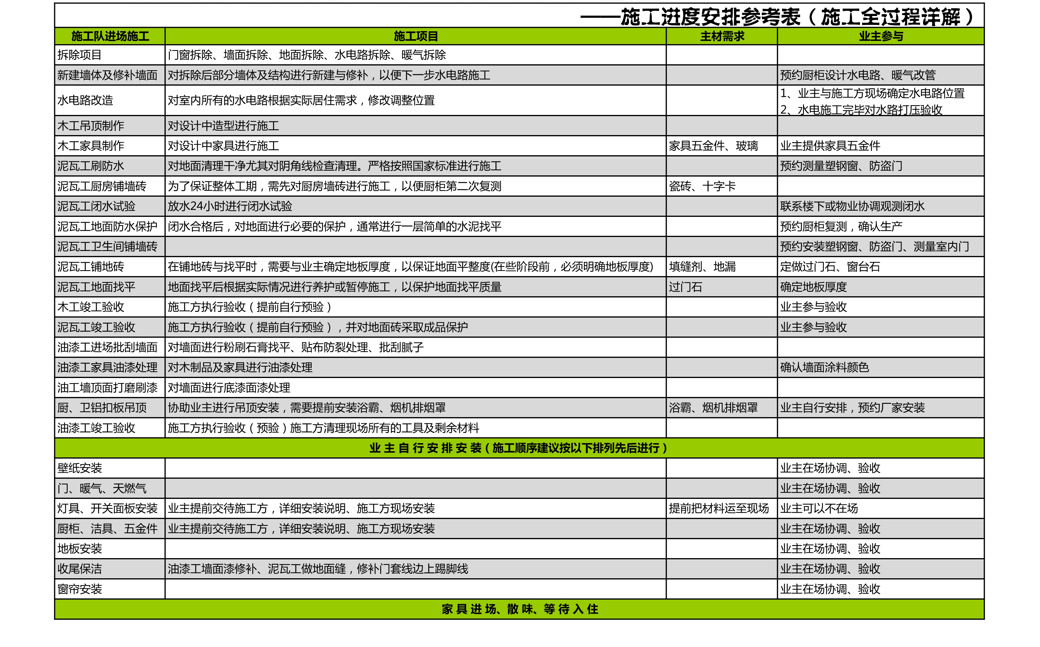 這是整個(gè)老房裝修細(xì)分施工步驟過程詳解,詳細(xì)說明每個(gè)施工步驟做什么,對(duì)應(yīng)每個(gè)過程裝修業(yè)主需要配合什么,如果能讓施工方根據(jù)這張表來制定詳細(xì)的施工階段進(jìn)度,就可以非常輕松的安排自己的裝修過程,不至于出現(xiàn)因?yàn)闀r(shí)間安排而耽誤裝修周期。