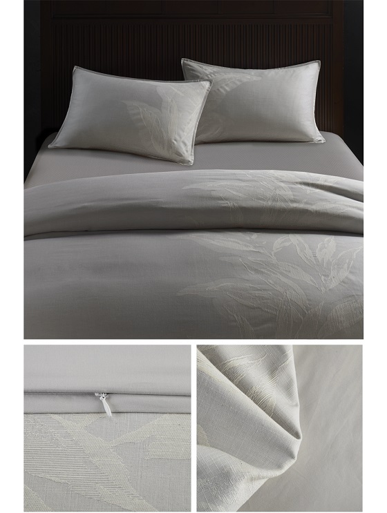 淺灰底配以隱約米黃葉片的花型,雅致自然,為臥室增添一份平和與寧?kù)o。正面面料采用全棉定位大提花,背面面料采用PIMA棉,品質(zhì)高級(jí),宛如花瓣般細(xì)致,使用感親膚舒適,醞釀深度好眠。