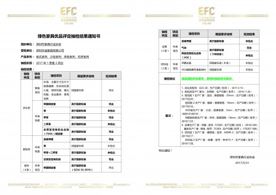 5月31日,天誠家具一季度2月份抽檢工作宣告結(jié)束,天誠家具以“成品抽檢符合要求;原材料抽檢符合要求”的完美成績,捍衛(wèi)企業(yè)的品牌榮譽。