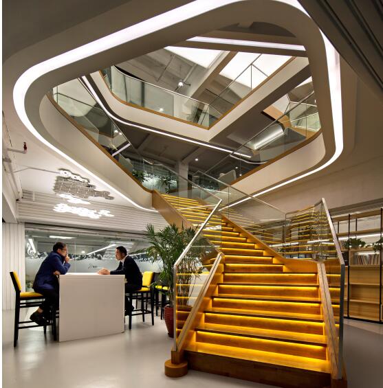 在舊廠房改造的過程中,歐普商用照明極力發(fā)揮其個性定制能力、滿足企業(yè)不同空間的照明需求。華人照明設(shè)計師聯(lián)合會(CLDA)謝茂堂會長在參觀諾亞財富總部后表示:“國內(nèi)利用舊廠房改造辦公空間,無論在設(shè)計手法、照明方式上,都會是一個趨勢,諾亞財富在旋轉(zhuǎn)樓梯處營造自然光,很符合照明產(chǎn)品個性定制化需求。”而這樣的個性化定制在現(xiàn)場隨處可見,比如歐普商照在天花板覆蓋了一層光照層,這樣就可以提升空間的高度。