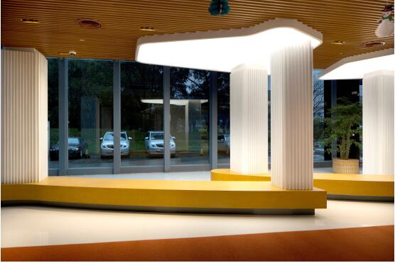 大堂作為公司的門面,在光線條件有限情況下,歐普商照通過光影運用在較小空間內(nèi)、制造明暗變化,并利用發(fā)光膜點綴柱子,明亮度對比強烈,形成很強的視覺沖擊力。