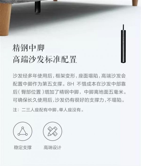 值得一提的是,沙發(fā)配備了精鋼中腳(臀部位置),作為四條腿之外的第五支撐,確保長久使用后,沙發(fā)仍有很好的支撐力,不塌陷。此外,8H獨立袋裝彈簧布藝沙發(fā)采用全拆裝掛扣插銷設(shè)計,整個安裝過程,無需擰一個螺絲,通過五金件之間的連接即可輕松組裝。