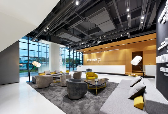 落地玻璃也室外景色無(wú)縫連接,細(xì)看玻璃上還有英文字母的水印,E-PARK的字母組合成柱狀,不統(tǒng)一的朝向展現(xiàn)自由意味。