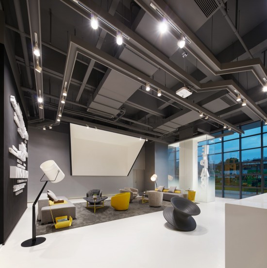 從另一個(gè)角度看,結(jié)合落地?zé)襞c投影幕造型,以及吊頂?shù)墓I(yè)化設(shè)計(jì),仿似一個(gè)大型的攝影棚。