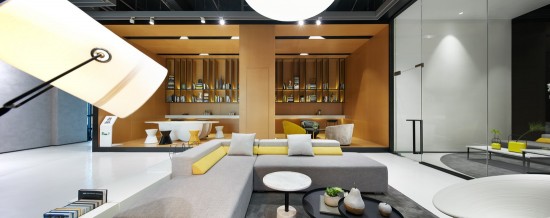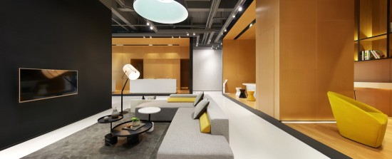淡洽區(qū)以簡(jiǎn)約的明黃色為主調(diào),沙發(fā)則走高級(jí)灰路線(xiàn),項(xiàng)目名稱(chēng)醒目地打在明黃色的墻上,logo的筆觸設(shè)計(jì)強(qiáng)勁而有力。