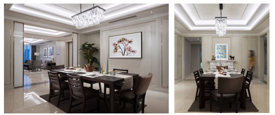 餐廳與客廳的水晶燈用得恰到好處,水晶條與光線共舞,映射出斑斕光暈和完美幾何形狀,為簡約的空間增加靈動(dòng)。
