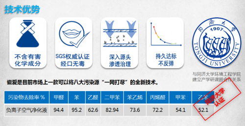 首先,在產(chǎn)品成分上,瓷愛負(fù)離子空氣凈化液,不含任何有害化學(xué)成分,能夠免除消費(fèi)者的后顧之憂。其次,它可以滲透到污染源內(nèi)部,通過擠占解吸作用并加速污染物質(zhì)的釋放。值得一提的是,這項(xiàng)和同濟(jì)大學(xué)環(huán)境工程學(xué)院共同完成的課題從研發(fā)到測試結(jié)果都是由同濟(jì)大學(xué)檢測認(rèn)證,具有權(quán)威性。