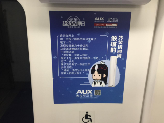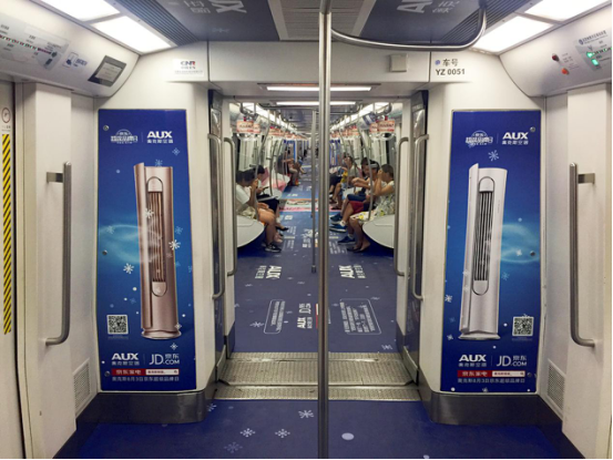 地鐵作為覆蓋人群數(shù)量較大的一種廣告媒介,一直以來都是品牌營銷比較看重的地方。近日,北京、杭州地鐵就被奧克斯空調(diào)的一抹藍(lán)所承包,在炎炎夏日,走進(jìn)地鐵站瞬間給人一種絲絲“涼意”,從而引爆社交網(wǎng)絡(luò)圈。此次,奧克斯空調(diào)聯(lián)手京東,以“史上超冷的廣告”為創(chuàng)意點(diǎn),結(jié)合各類冷笑話,營造出車站與車廂“酷冷”的感覺,賺足了消費(fèi)者的好感度。