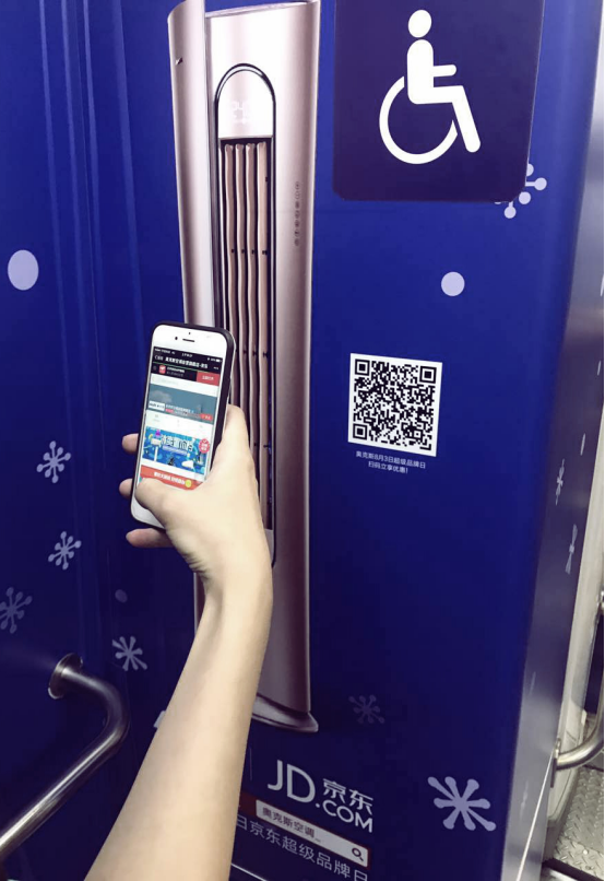在地鐵車廂內(nèi),消費(fèi)者在看每個(gè)冷笑話的同時(shí),掃一掃冷笑話下方的二維碼可以參與到奧克斯空調(diào)&8.3京東超品日的活動(dòng)中來,完成第一步與品牌的互動(dòng)。通過掃二維碼進(jìn)入奧克斯空調(diào)優(yōu)惠活動(dòng)的頁面,第二步就是可以根據(jù)自己的需求選擇心儀的產(chǎn)品。通過線上線下的活動(dòng)聯(lián)動(dòng),加快了從品牌的初印象到品牌產(chǎn)品購買的過程,這種“互動(dòng)化傳播”打破了傳統(tǒng)地鐵廣告單向傳播的方式。