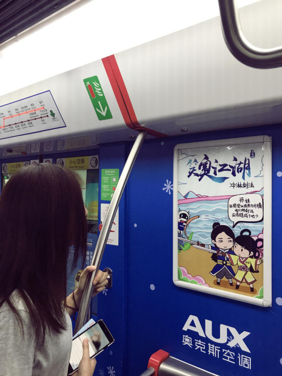 然而,有小伙伴還發(fā)現(xiàn)在地鐵的車廂底部也是奧克斯空調(diào)精心繪制的“笑奧江湖”漫畫,以詼諧的手法將笑傲江湖里的人物與奧克斯空調(diào)的品牌形象、產(chǎn)品調(diào)性相結(jié)合,傳遞出年輕化、時(shí)尚化的品牌理念。