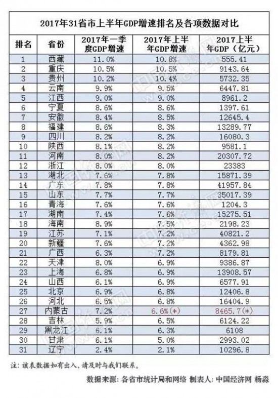 從表中可以看到,與一季度GDP增速相比,全國31個省市中有西藏、云南、福建、海南、新疆、天津、北京、內(nèi)蒙古、甘肅、遼寧10地上半年GDP增速有所回落。重慶、江西、寧夏、四川、浙江、廣東、山東、青海8地的GDP增速與一季度持平。其它13個省份的GDP增速較一季度有所增長。