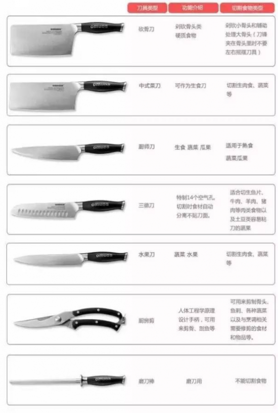 如果是注重生活品質(zhì),特別是喜歡烹飪西餐的消費(fèi)者,經(jīng)常會(huì)使用到砍骨刀、中式菜刀、廚師刀、三德刀、水果刀、磨刀棒、廚房剪等刀具。可以說(shuō),選擇一把合適的刀具,知曉一些辨別刀具的方法,能為精致的廚房生活錦上添花。