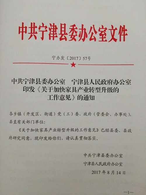 近日,中共寧津縣委辦公室、寧津縣人民政府辦公室印發(fā)縣委縣政府《關(guān)于加快家具產(chǎn)業(yè)轉(zhuǎn)型升級(jí)的工作意見(jiàn)》,對(duì)家具產(chǎn)業(yè)如何解決小散亂污等問(wèn)題,推動(dòng)產(chǎn)業(yè)轉(zhuǎn)型升級(jí),從而實(shí)現(xiàn)健康發(fā)展作出總體部署。