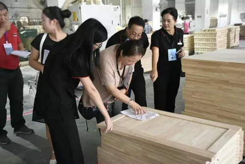 復(fù)評審作為此次專家評審組工廠評審的首要目的,三位專家在和企業(yè)進(jìn)行簡短的交流后便深入生產(chǎn)工廠,從材料車間、木工車間、裁剪車間到半成品車間、組裝車間、成品車間,對企業(yè)的供應(yīng)鏈管理、品質(zhì)管理到生產(chǎn)制造工藝進(jìn)行詳細(xì)的評定,包括此前企業(yè)存在的看板管理缺失等問題也進(jìn)行詳細(xì)復(fù)查。