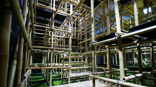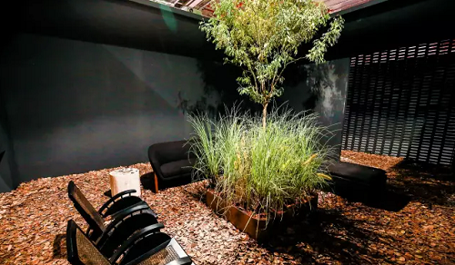 整個空間以黑色的盒子呈現(xiàn),斑駁中透著光影,入口與內(nèi)部空間形成黑白、壓縮與開闊的節(jié)奏對比。進入狹窄的玄關(guān)長廊,頂部下壓的弧線把長廊壓縮在極具張力的小空間里;進入主空間后,豁然開朗,頂部營造自然天光、地面鋪滿的綠色落葉將在時間的緩慢推移中呈現(xiàn)出枯黃……