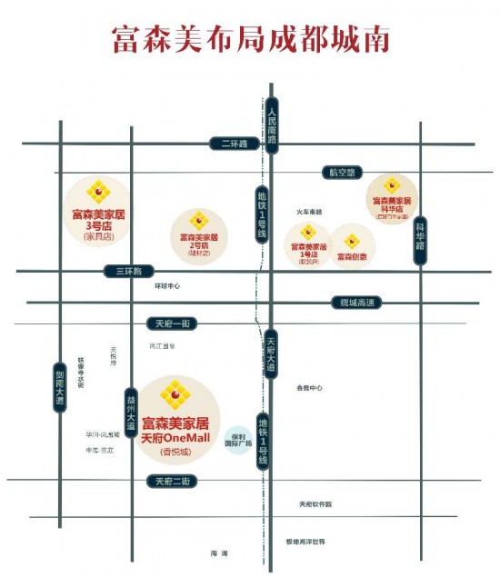 分別是位于成都城南的軟裝1號店、建材2號店、家具3號店、富森創(chuàng)意,位于城北的進(jìn)口館、建材館、家具館、裝飾建材總部市場、今年7月剛開業(yè)的名品街大店集群,以及富森美新都店。